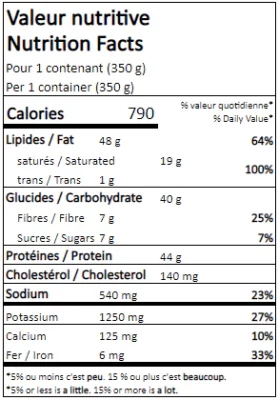 Purée de carottes (pomme de terre (pommes de terre, métabisulfite de sodium), carottes, crème (crème, lait, dextrose, cellulose microcristalline, gomme de caroube, gomme de cellulose, carraghénine, polysorbate 80), beurre salé (crème (lait), sel, peut contenir colorant (rocou)), sel), boeuf, sauce (eau, oignons, base sauce demi-glace (farine de blé, sucre, protéines végétales hydrolysées (soya, maïs), sel, fécule de pomme de terre, glutamate monosodique, légumes déshydratés (tomate, oignon, betterave), vin rouge déshydraté, huile de palme, maltodextrine, extrait de levure, inosinate disodique, guanylate disodique, acide citrique, épices, couleur, saveur naturelle, sulfites), mélange pour soupe à l’oignon (oignon déshydraté, sucres (extrait sec de sirop de maïs, dextrose, maltodextrine), amidon de maïs, protéines végétales hydrolysées (soya), sel, huile de palme, farine de blé (blé, gluten), glutamate monosodique, colorant caramel (sulfites), acide citrique, inosinate disodique, guanylate disodique, extraits d’épice, fines herbes), concentré de boeuf (bouillon de boeuf reconstitué (eau, bouillon boeuf), sucres (solides de glucose), sel, glutamate monosodique, caramel en poudre, protéines de maïs hydrolysées (dextrose, huile de tournesol), amidon de maïs modifié, saveur (extrait de levure), acide citrique, mono et diglycérides, poudre d’oignon, poudre d’ail, gomme xanthane, inosinate disodique, guanylate disodique), amidon de maïs modifié), pois.